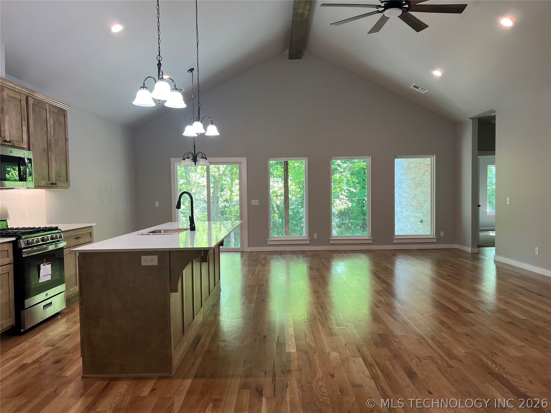 Welcome to lake living with a short drive to town. Newer construction 3 bedroom, 2 bathroom home with an attached generous sized two car garage all on one level. (This home has only been gently lived in for 6 months). Located in the Toppers area on Lake Fort Gibson, which has a public boat ramp in the neighborhood. Hardwood floors in the main living areas with a timeless beam spanning the spacious living room and vaulted. A wall of windows across the back allows for plenty of natural light. Kitchen has an island for extra seating and ease of entertaining. Stainless steel appliances. Large pantry, Solid surface countertops throughout. Gas log fireplace. Spacious rooms with fantastic walk-in closets. Covered front and back porches. This home has 1/3 of an acre giving you plenty of space, however if you would like to purchase with MLS#2615085 which is an additional 1/3 of an acre you would have 0.69 of an acre all together. Backs to CORP OF ENG property which leads down to the lake. No HOA and an UNBEATABLE PRICE for newer construction! All financing works for this one USDA/FHA/CONV/VA/CASH